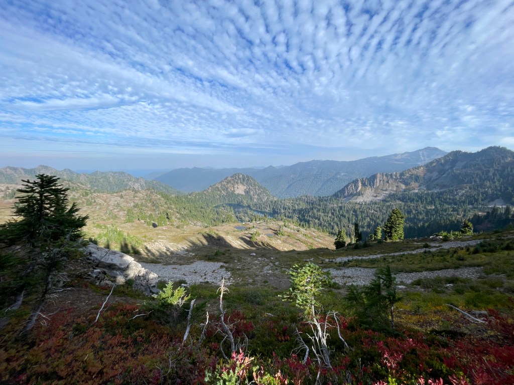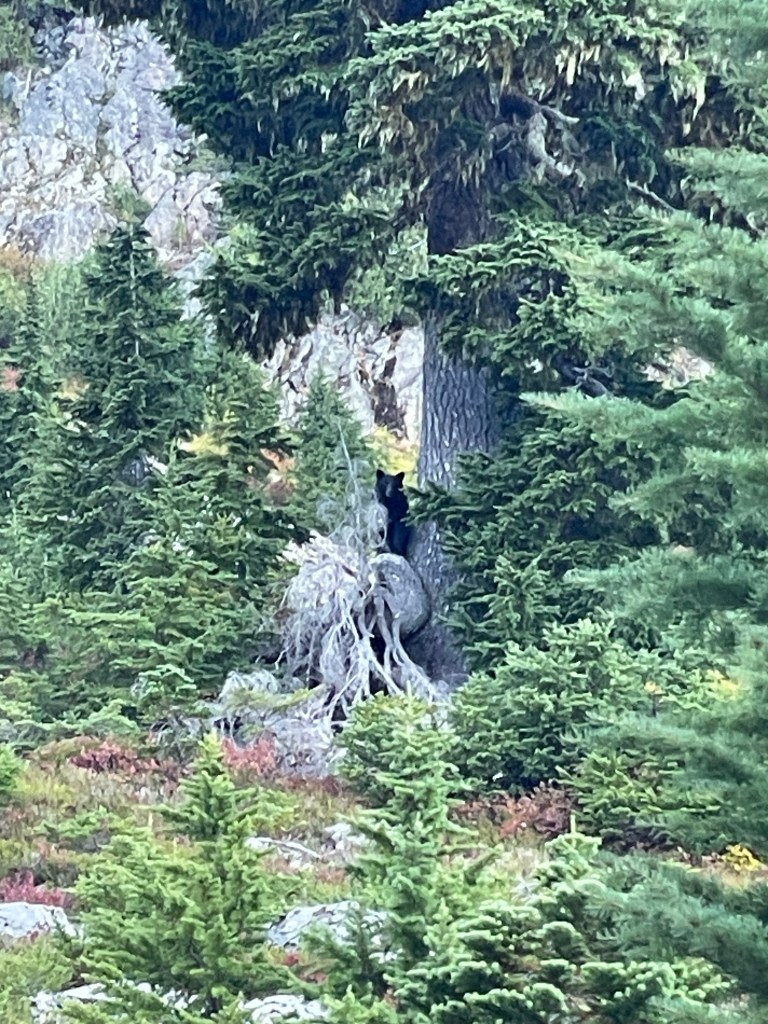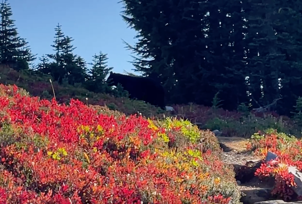 At one point, we came upon a black bear who was enjoying some huckleberries right in the middle of the trail! We tried to wait for him to move, but he was way too intrigued with those berries. Instead, we went off trail a bit to give him a wide berth, and continued on.