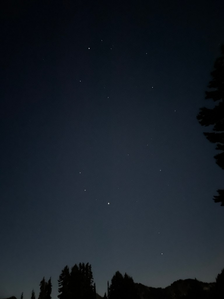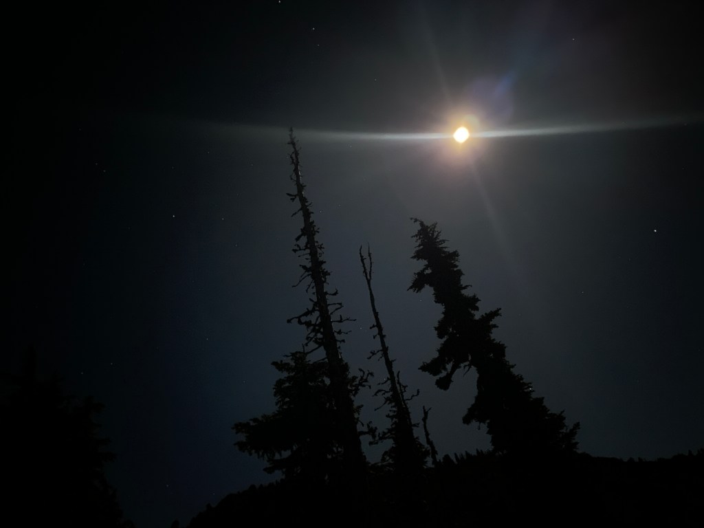 I climbed out of the tent into the chilly air, admittedly at first to pee, but then to stand in awe, staring at the full moon and stars. The moon was so full, in fact, that I didn’t even need a headlamp to find my way to Pee Tree. I felt wide awake at this point, so just stood outside to experience the majesty and tranquility of an incredibly clear, bright night. (And take some pictures of the sky, of course).