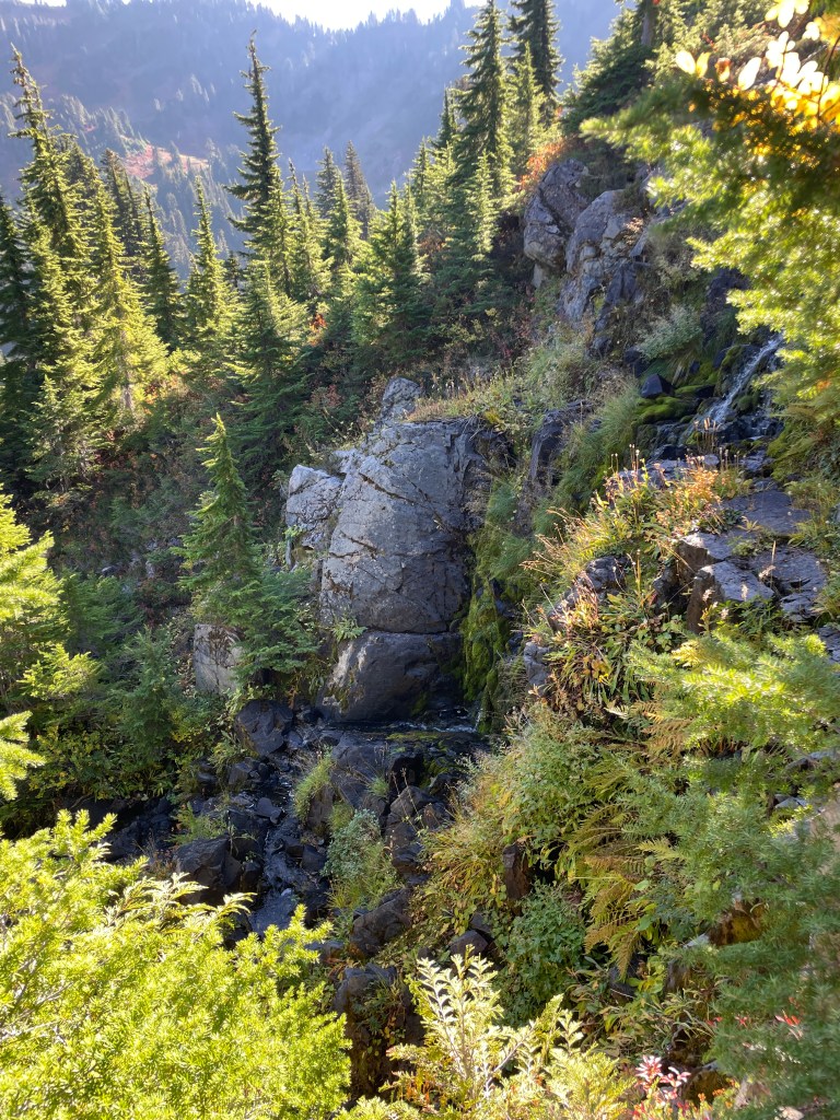 Just before we reached Heart Lake, the High Divide Trail split into the Cat Basin Primitive Trail on the right and the Sol Duc River Trail on the left — we took the latter. On our way down, we saw some cool water features and fungi.